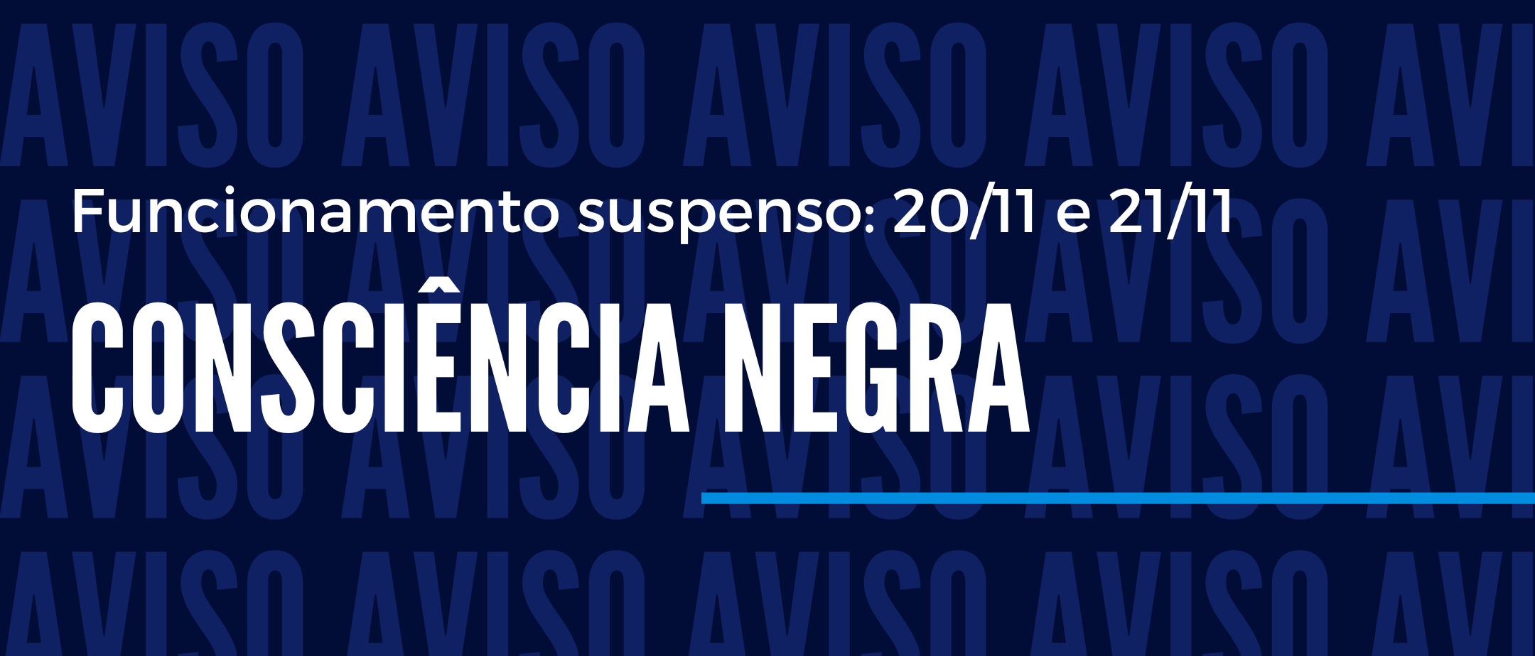 Informamos que nos dias 20 e 21/11 (respectivamente quinta e sexta-feira) NÃO HAVERÁ EXPEDIENTE devido ao Dia Nacional de Zumbi e da Consciência Negra. Retornaremos com o funcionamento regular na segunda, 24/11/2025.